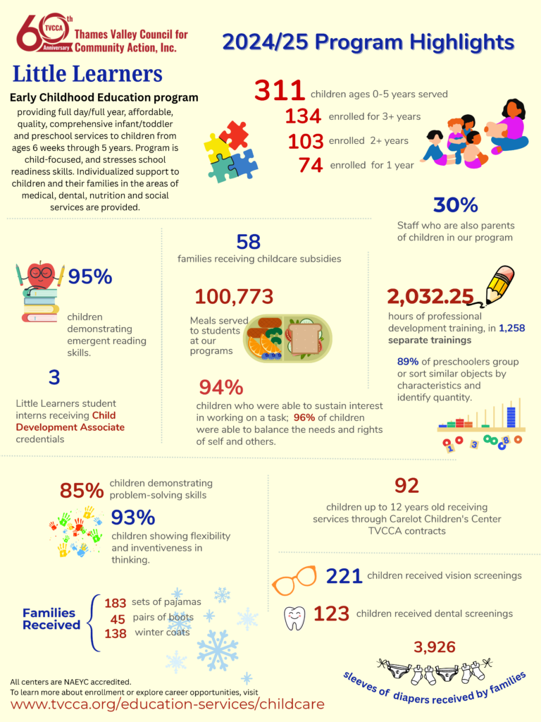 Little Learners is a comprehensive Infant/Toddler, Preschool and Childcare program that serves children from birth through age five, and their families. The program is child-focused and has the overall goal of increasing the school readiness of young children. It offers individualized services in the areas of education, medical, dental, nutrition and social services.